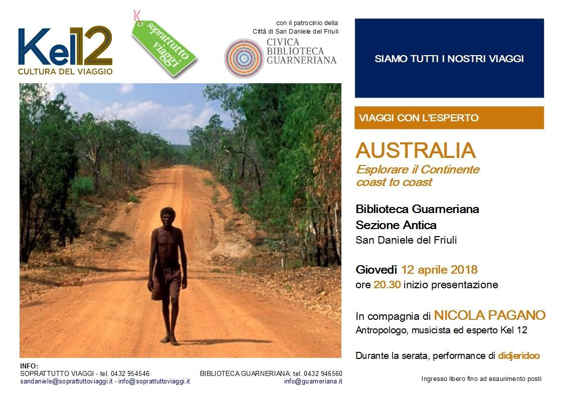 Incontro con Nicola Pagano, esperto per il tour operator Kel12, che ci porterà a scoprire l'Australia, da costa a costa in un meraviglioso viaggio accompagnato dalle performance musicali con il didjeridoo, strumento a fiato degli aborigeni.