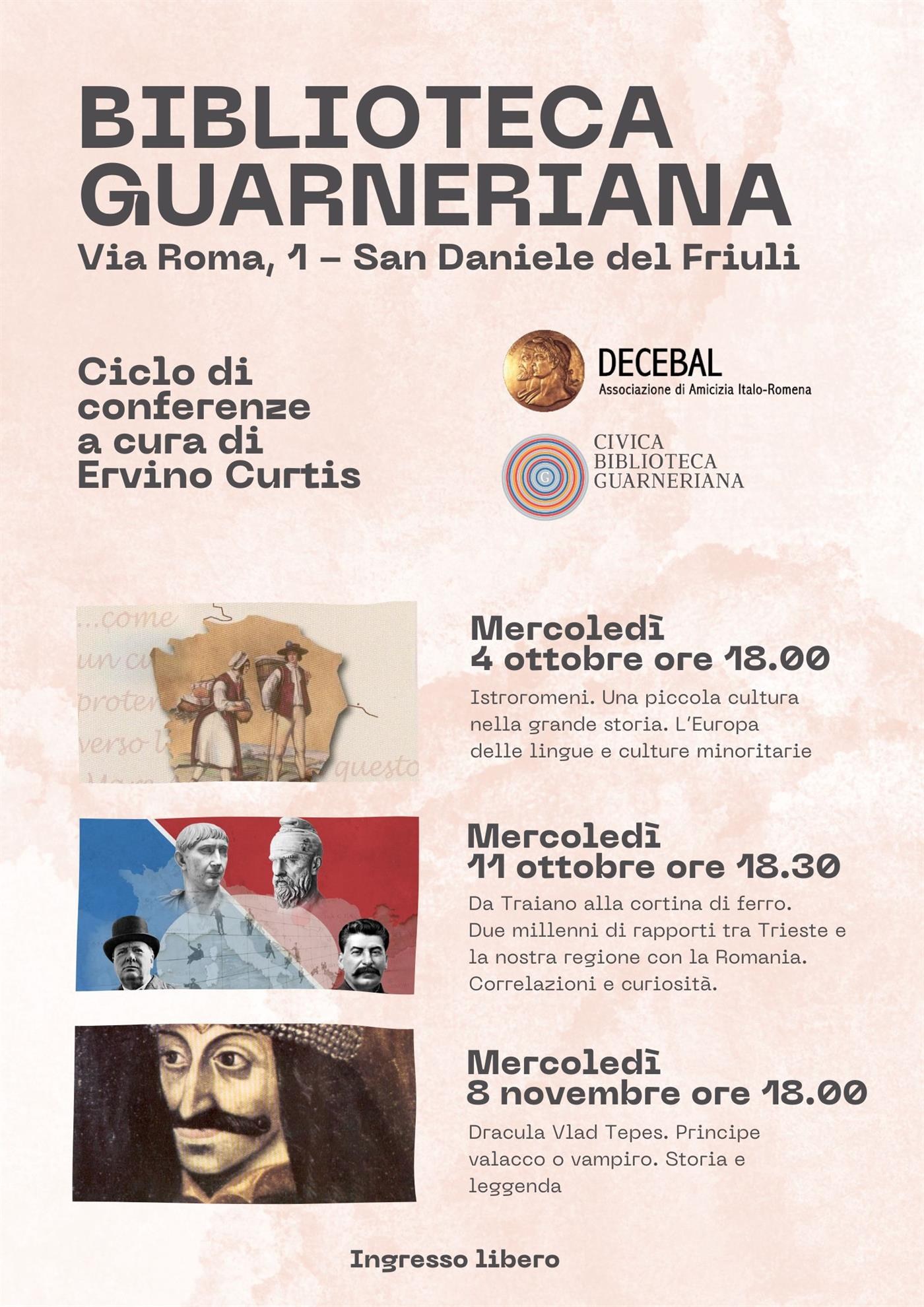 La biblioteca Guarneriana nel mese di ottobre e novembre ospiterà un ciclo di conferenze a cura di Ervino Curtis, presidente dell'Associazione di amicizia Italo-Romena DECEBAL, fondata nel 1987 con il principale obiettivo di far conoscere agli italiani, specialmente nell’ambito della Regione Friuli Venezia Giulia e Trieste, la cultura, la storia e le tradizioni del popolo romeno.