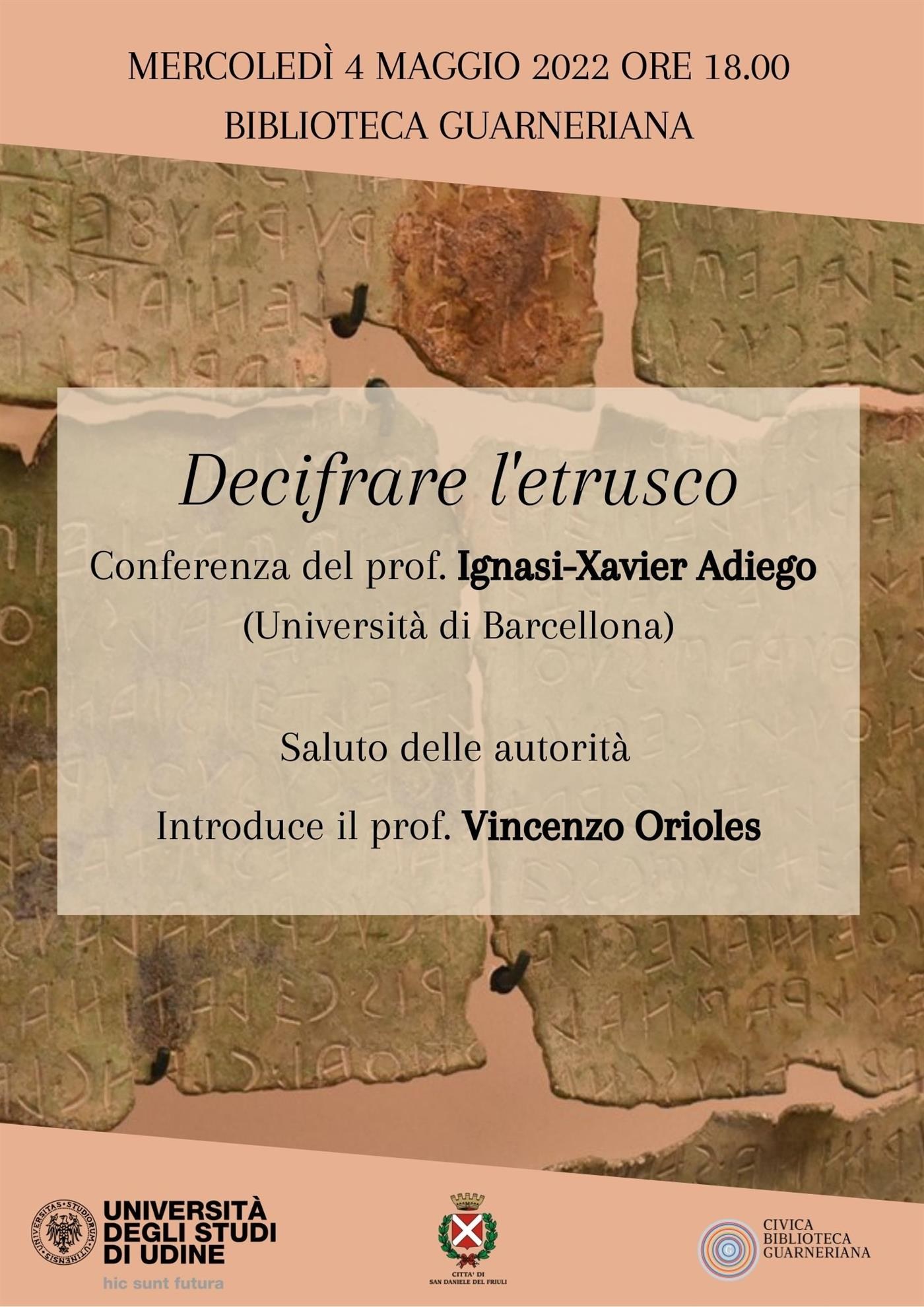 il prof. Ignasi-Xavier Adiego dell'Università di Barcellona, terrà una conferenza dal titolo Decifrare l'etrusco.