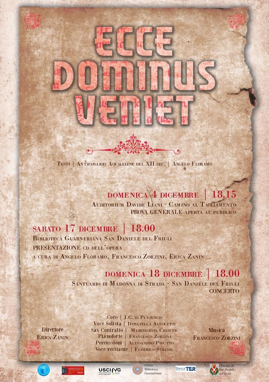 Sabato 17 dicembre 2022 alle ore 18.00 in Biblioteca Guarneriana, si terrà la presentazione dell'opera e del disco Ecce dominus veniet, prima e unica reinterpretazione in chiave moderna della musica contenuta nell’antichissimo MS 4 Mattutinale Aquileiese guarneriano, a cura del coro J.C. di Plasencis, in collaborazione con la Biblioteca Guarneriana ed il sostegno del Comune di San Daniele del Friuli.