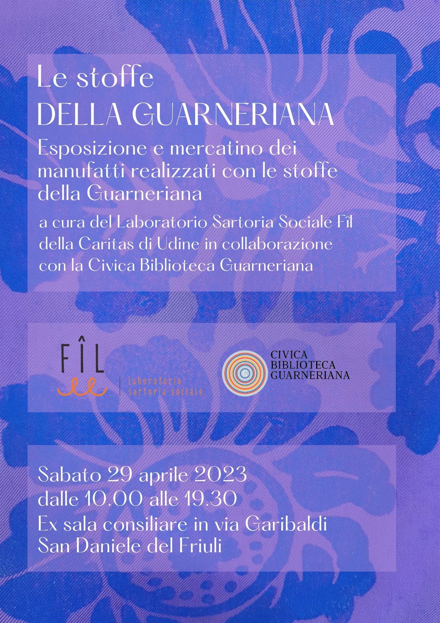 Sabato 29 aprile 2023, in occasione di San Daniele Sboccia, presso l'ex sala consiliare in via Garibaldi dalle 10.00 alle 19.30, sarà possibile visitare la mostra-mercatino dei manufatti realizzati con le stoffe della Guarneriana, un progetto a cura del Laboratorio Sartoria Sociale Fîl della Caritas di Udine in collaborazione con la Biblioteca Guarneriana.