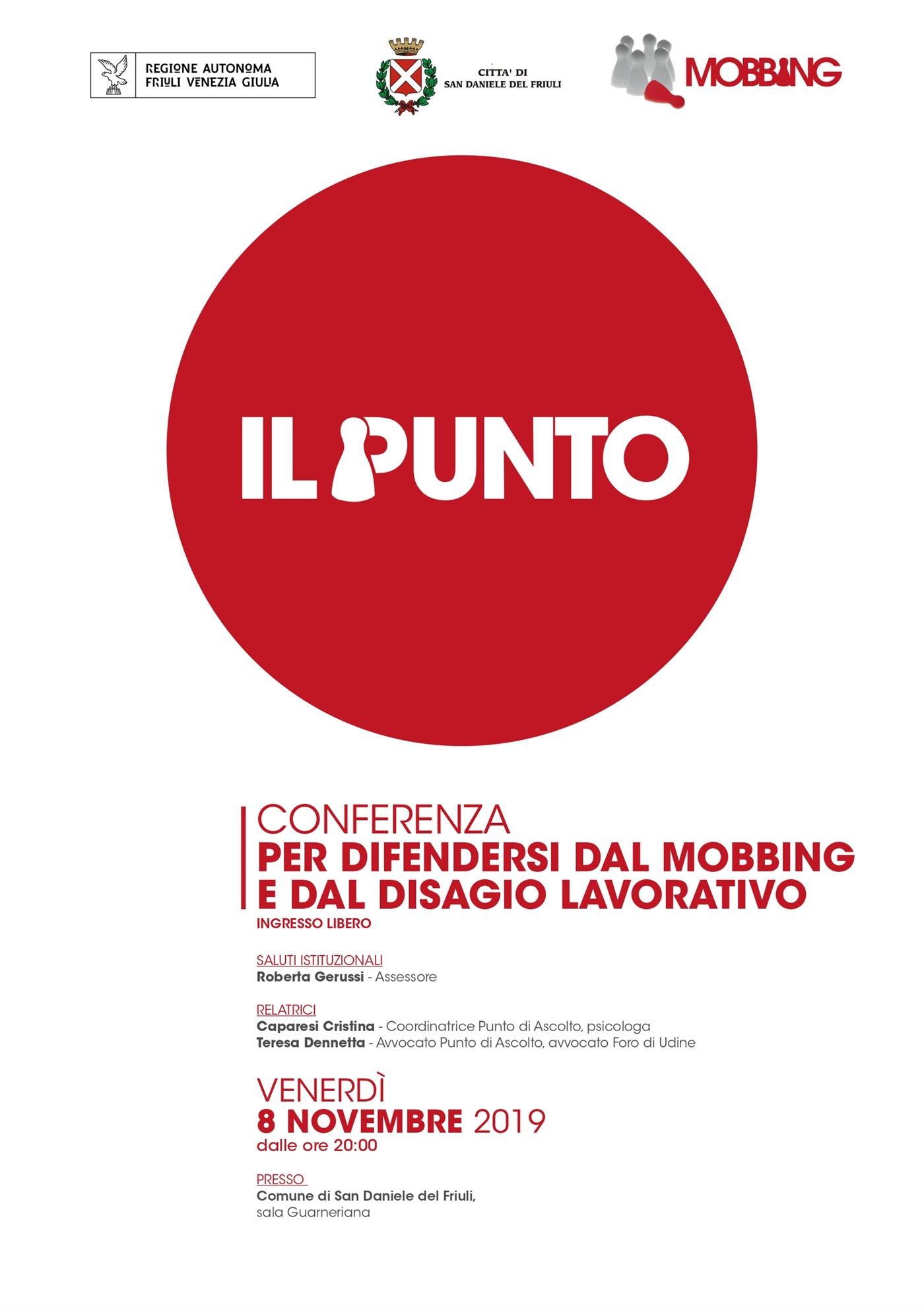 Incontro con Caparesi Cristina, psicologa e coordinatrice del Punto di Ascolto, e con Teresa Dennetta, avvocato Foro di Udine e avvocato del Punto di Ascolto, sui temi del mobbing e del disagio lavorativo e su come difendersi quando ci si ritrova in situazioni di questo tipo.