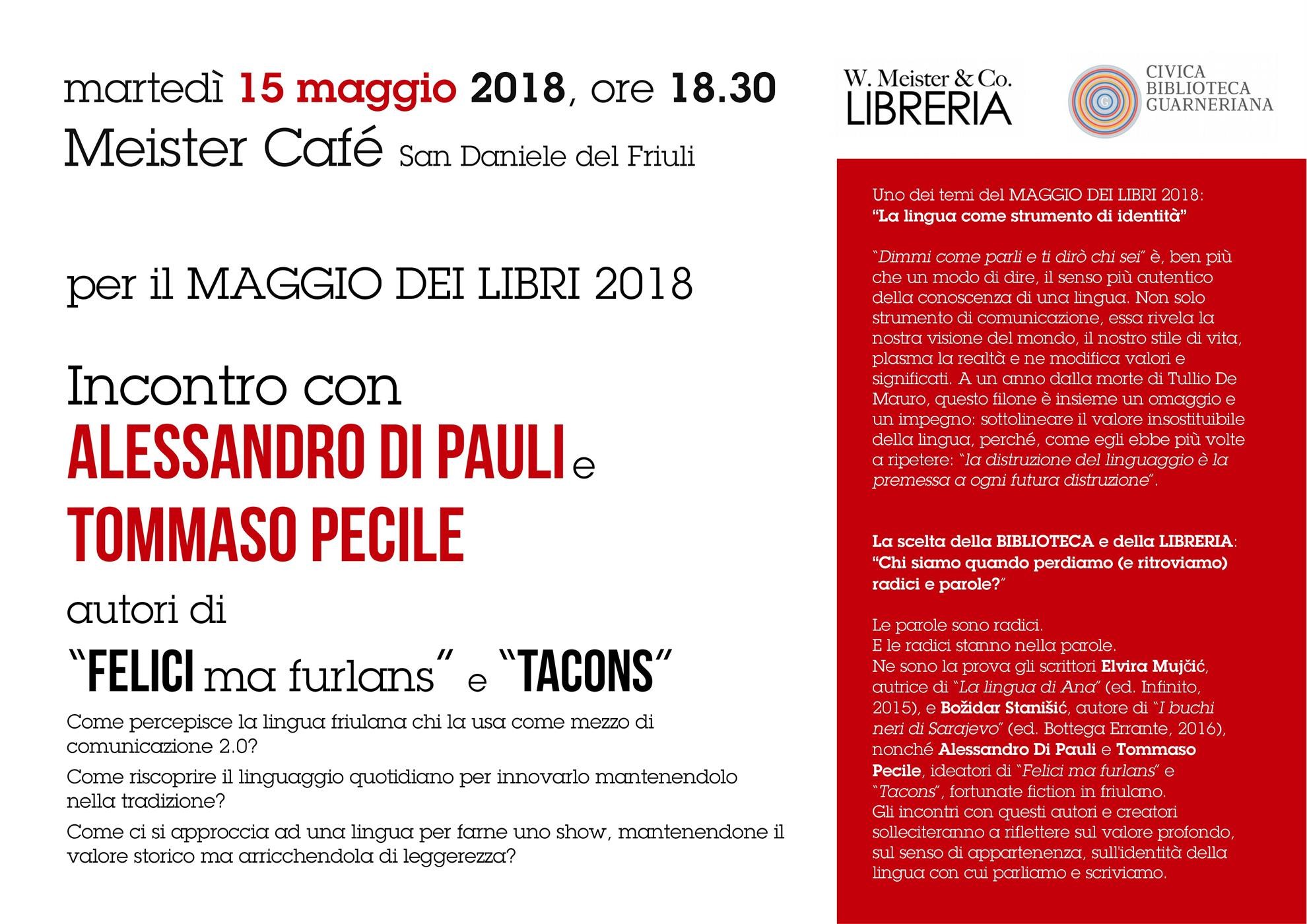 Con gli autori delle due fortunate fiction in lingua friulana "Felici ma Furlans" e "Tacons" parleremo di come è percepita questa lingua da chi la usa come mezzo di comunicazione 2.0, come si può riscoprire il linguaggio quotidiano per innovarlo mantenendolo nella tradizione e come ci si approccia ad una lingua per farne uno show, mantenendone valore storico ma arricchendola di leggerezza