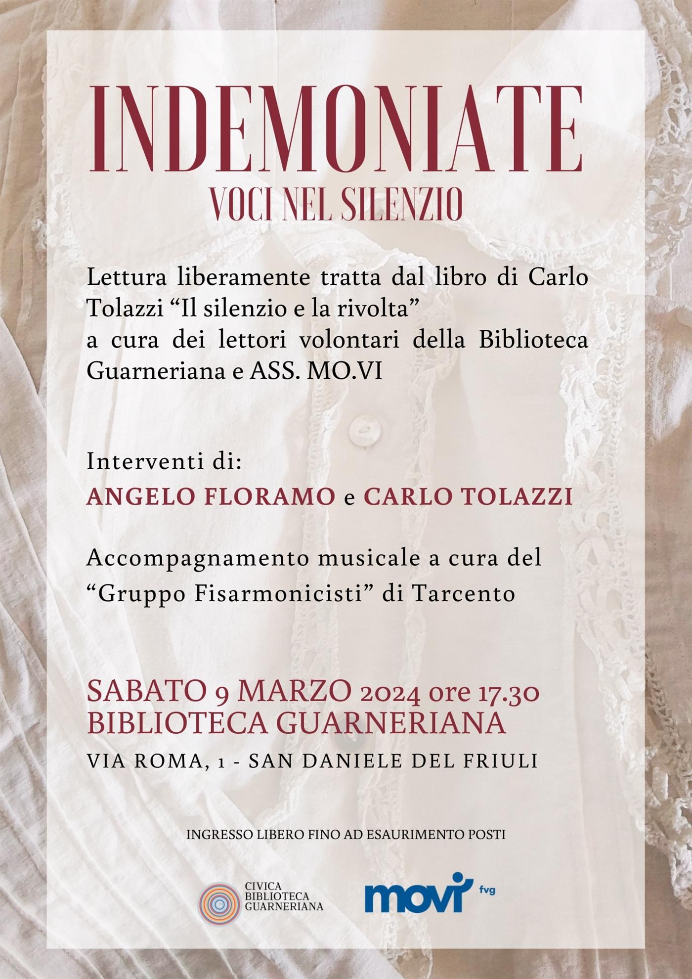 Sabato 9 marzo 2024 alle 17.30, in occasione della giornata internazionale della donna, il gruppo di lettori volontari della Biblioteca Guarneriana e del Movimento di Volontariato Italiano del Friuli (MOVI), proporrà una lettura tratta dal libro Il silenzio e la rivolta di Carlo Tolazzi, che vede protagoniste le donne della comunità di Verzegnis, tra il 1878 e il 1879.