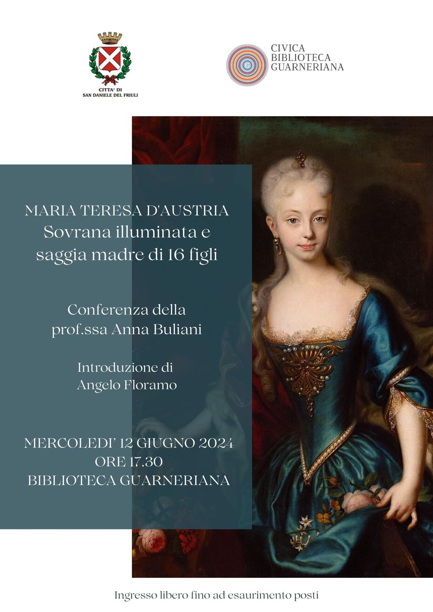 Mercoledì 12 giugno 2024 alle ore 17.30 in Biblioteca Guarneriana, la prof.ssa Anna Buliani terrà la conferenza Maria Teresa D'Austria, sovrana illuminata e saggia madre di 16 figli.