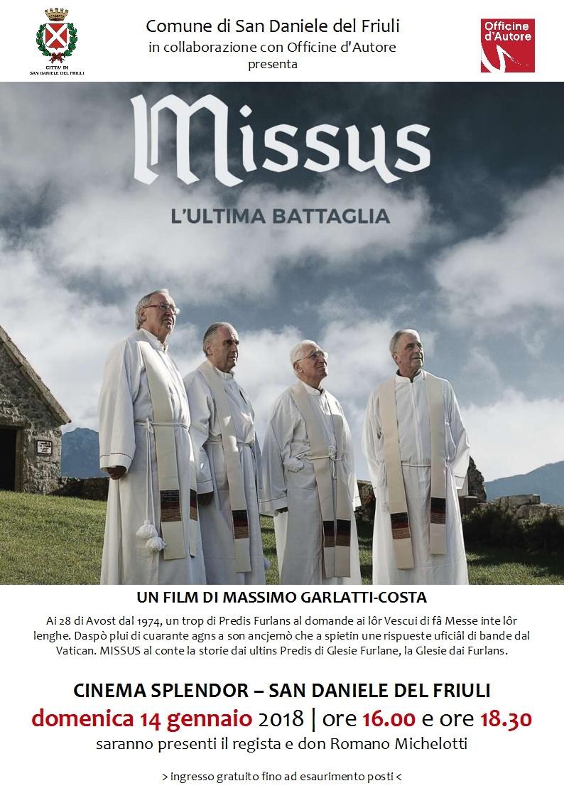 In collaborazione con l'Associazione Officine d'Autore, il Comune di San Daniele organizza una doppia proiezione di "MISSUS. L'ultima battaglia", un film del registra friulano Massimo Garlatti-Costa.