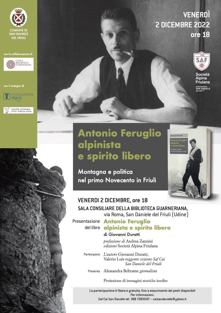 Venerdì 2 dicembre 2022 alle ore 18.00 presso la Biblioteca Guarneriana, verrà presentato il volume Antonio Feruglio alpinista e spirito libero: montagna e politica nel primo Novecento in Friuli di Giovanni Duratti, edito dalla Società Alpina Friulana.