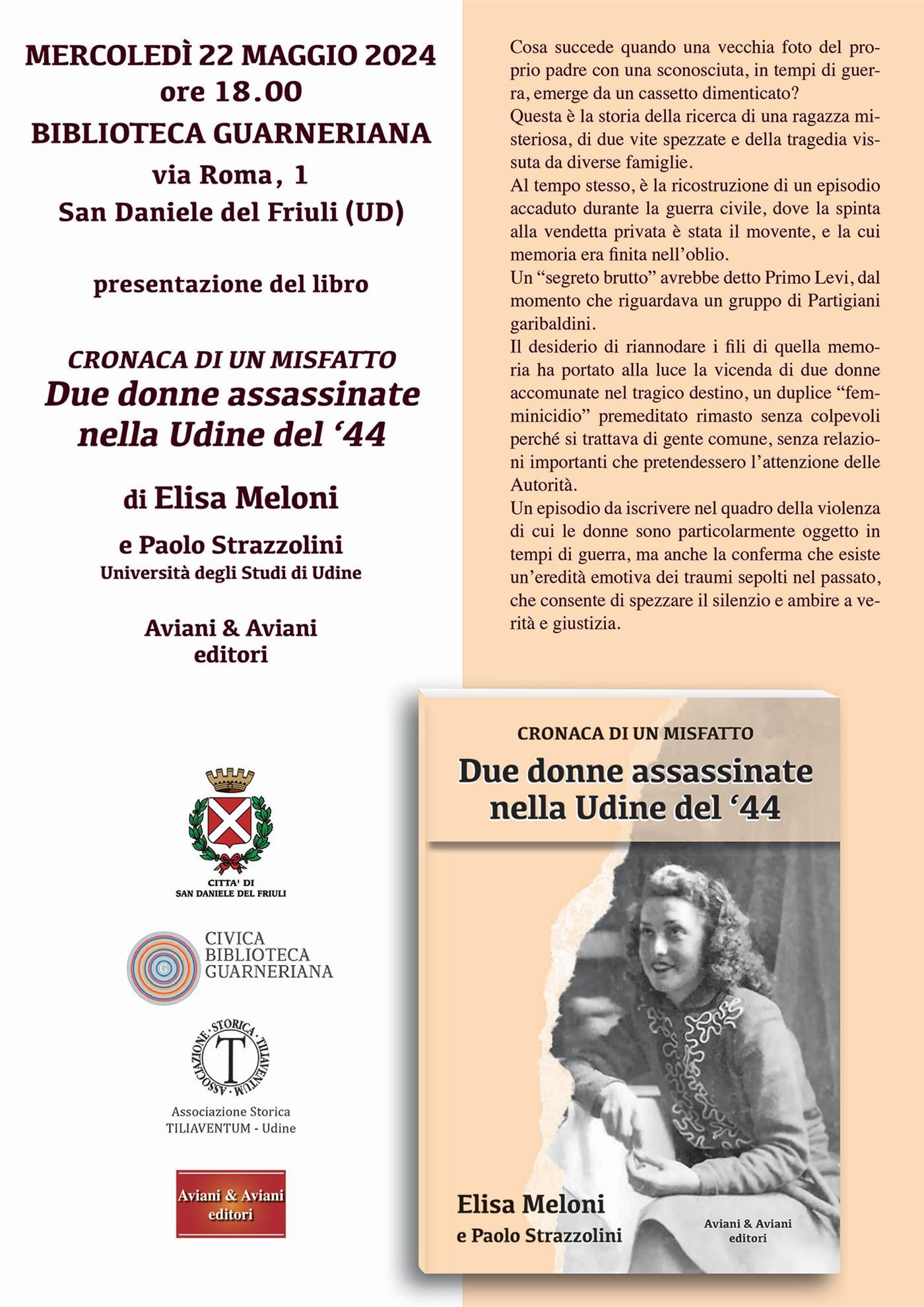 Mercoledì 22 maggio 2024 alle ore 18.00 in Biblioteca Guarneriana, verrà presentato il libro Cronaca di un misfatto. Due donne assassinate nella Udine del '44 (Aviani&Aviani Editori) di Elisa Meloni e Paolo Strazzolini (Università degli Studi di Udine).