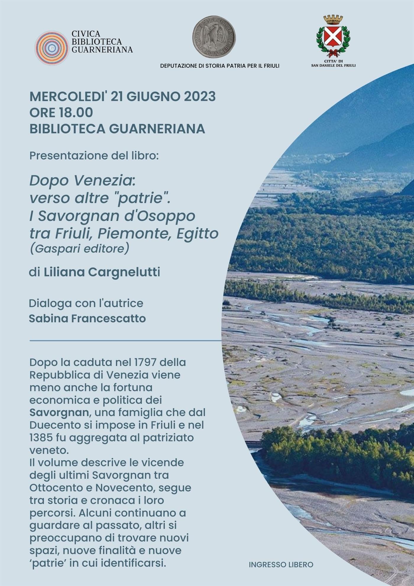 Mercoledì 21 giugno 2023 alle ore 18.00 in Biblioteca Guarneriana, verrà presentato il libro di Liliana Cargnelutti, Dopo Venezia: verso altre "patrie". I Savorgan d'Osoppo tra Friuli, Piemonte, Egitto (Gaspari editore).