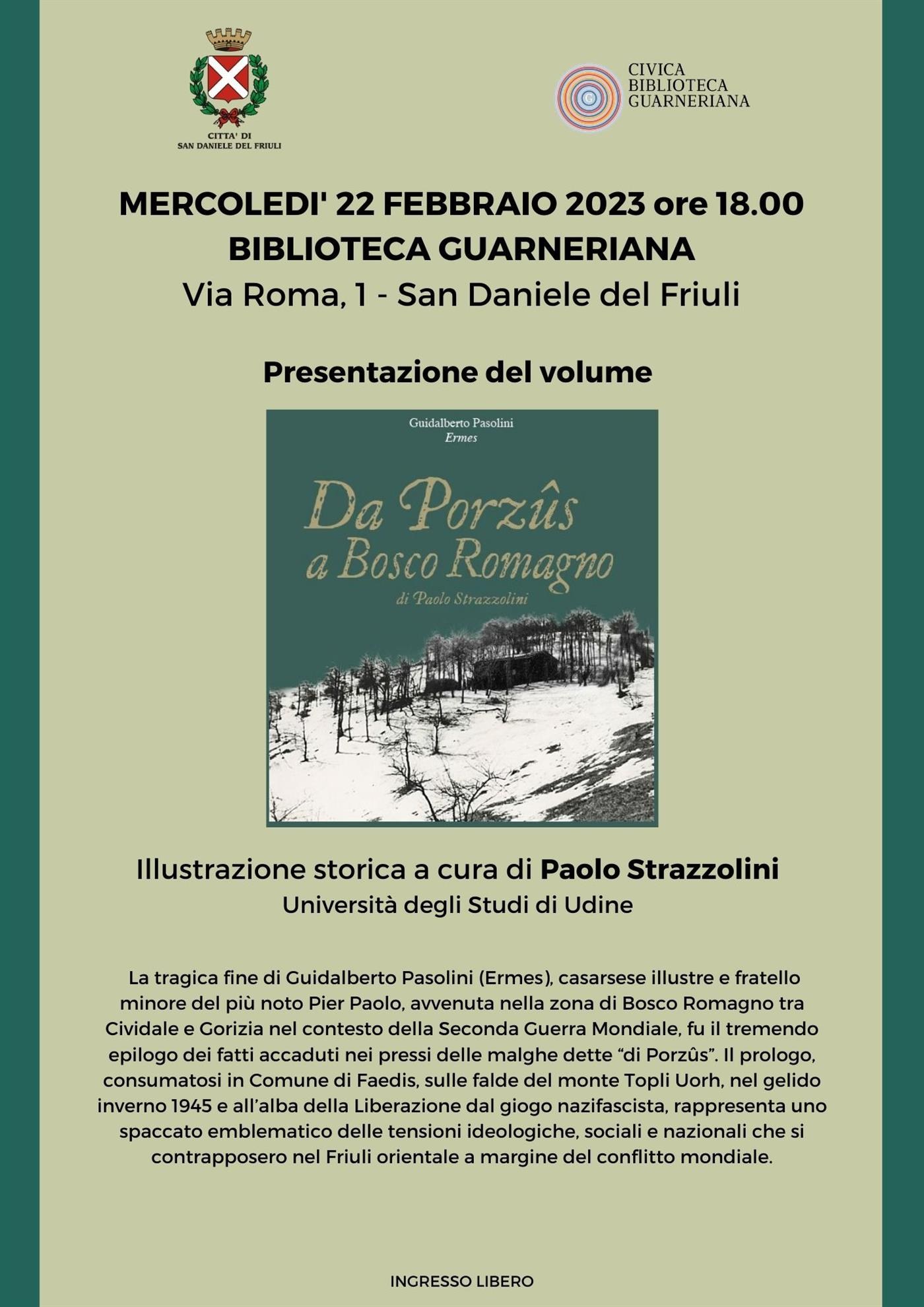 Mercoledì 22 febbraio 2023 in biblioteca Guarneriana, il prof. Paolo Strazzolini presenterà il suo libro Guidalberto Pasolini Ermes: da Porzûs a Bosco Romagno (Associazione culturale Forum democratico).