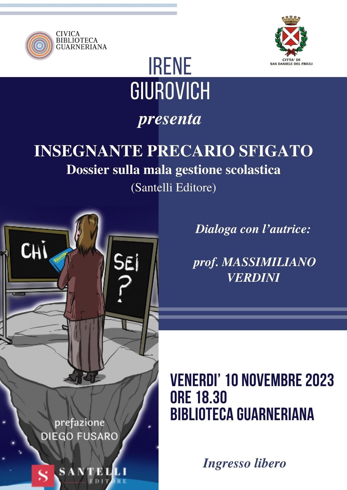 Venerdì 10 novembre 2023 alle ore 18.30 in Biblioteca Guarneriana, Irene Giurovich presenterà il suo libro Insegnante precario sfigato: dossier sulla mala gestione scolastica (Santelli Editore).