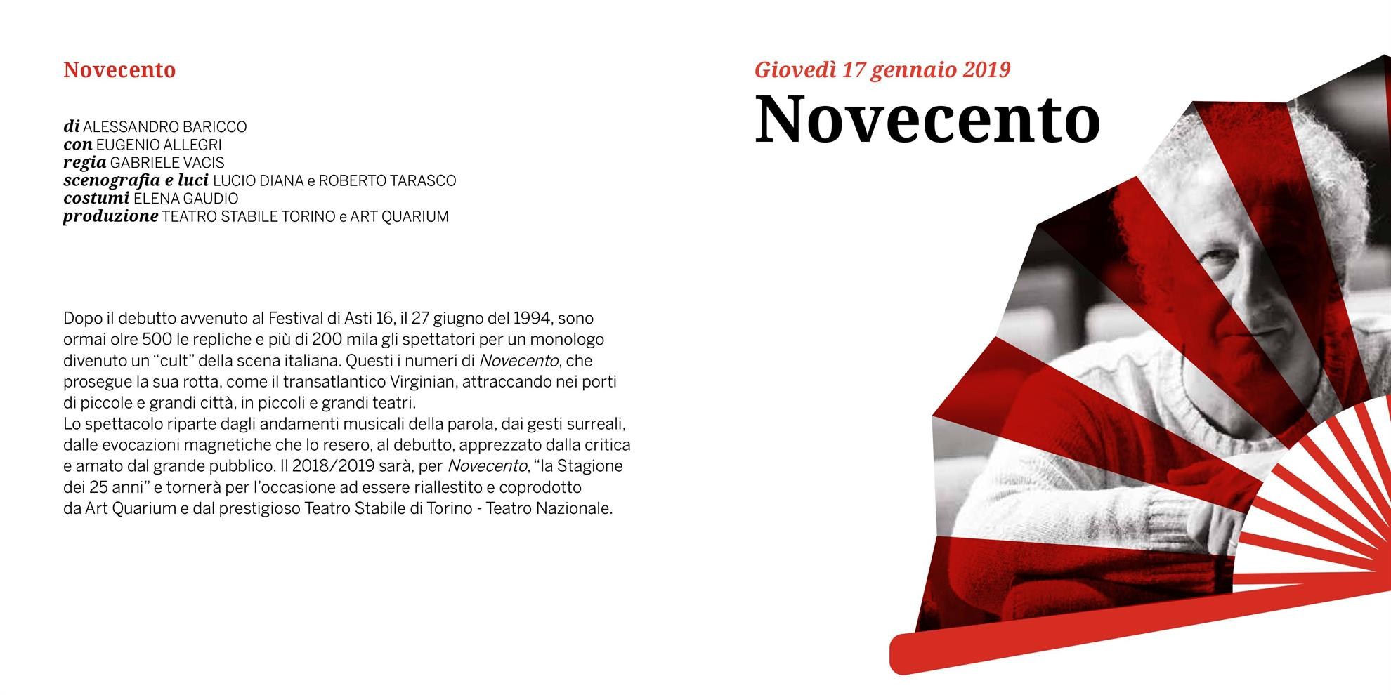 Il 2018/2019 sarà, per Novecento, “la Stagione dei 25 anni” e torna per l’occasione ad essere riallestito e coprodotto da Art Quarium e dal prestigioso Teatro Stabile di Torino - Teatro Nazionale.