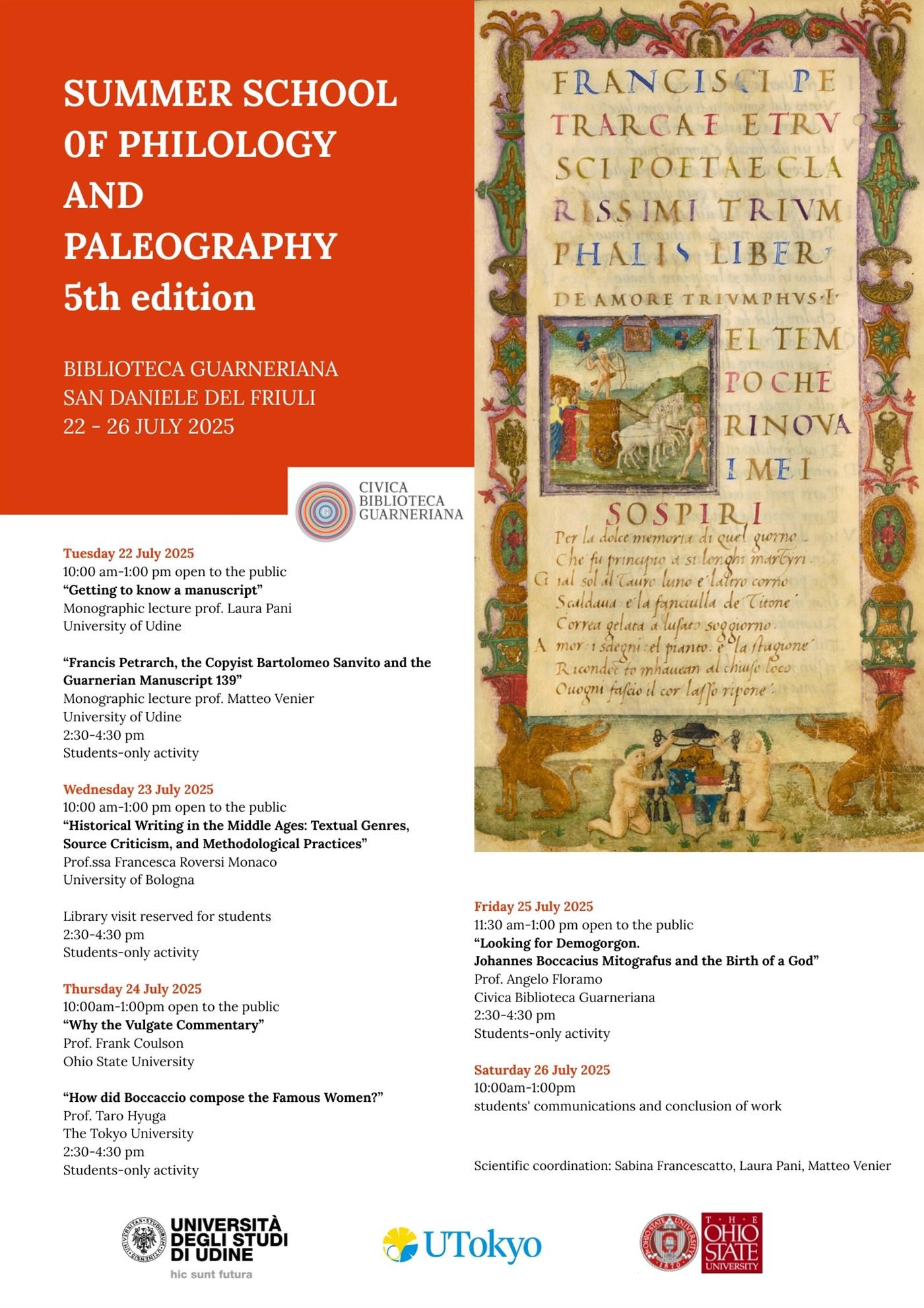 Dal 22 al 26 luglio 2025, in collaborazione con l’Università degli Studi di Udine, un'immersione nel mondo dei manoscritti antichi con lezioni aperte al pubblico su Boccaccio, Petrarca e molto altro: un’occasione per ascoltare le lezioni con docenti dell’Università di Udine, di Bologna, della Ohio State University e della Tokyo University, leggi il programma!