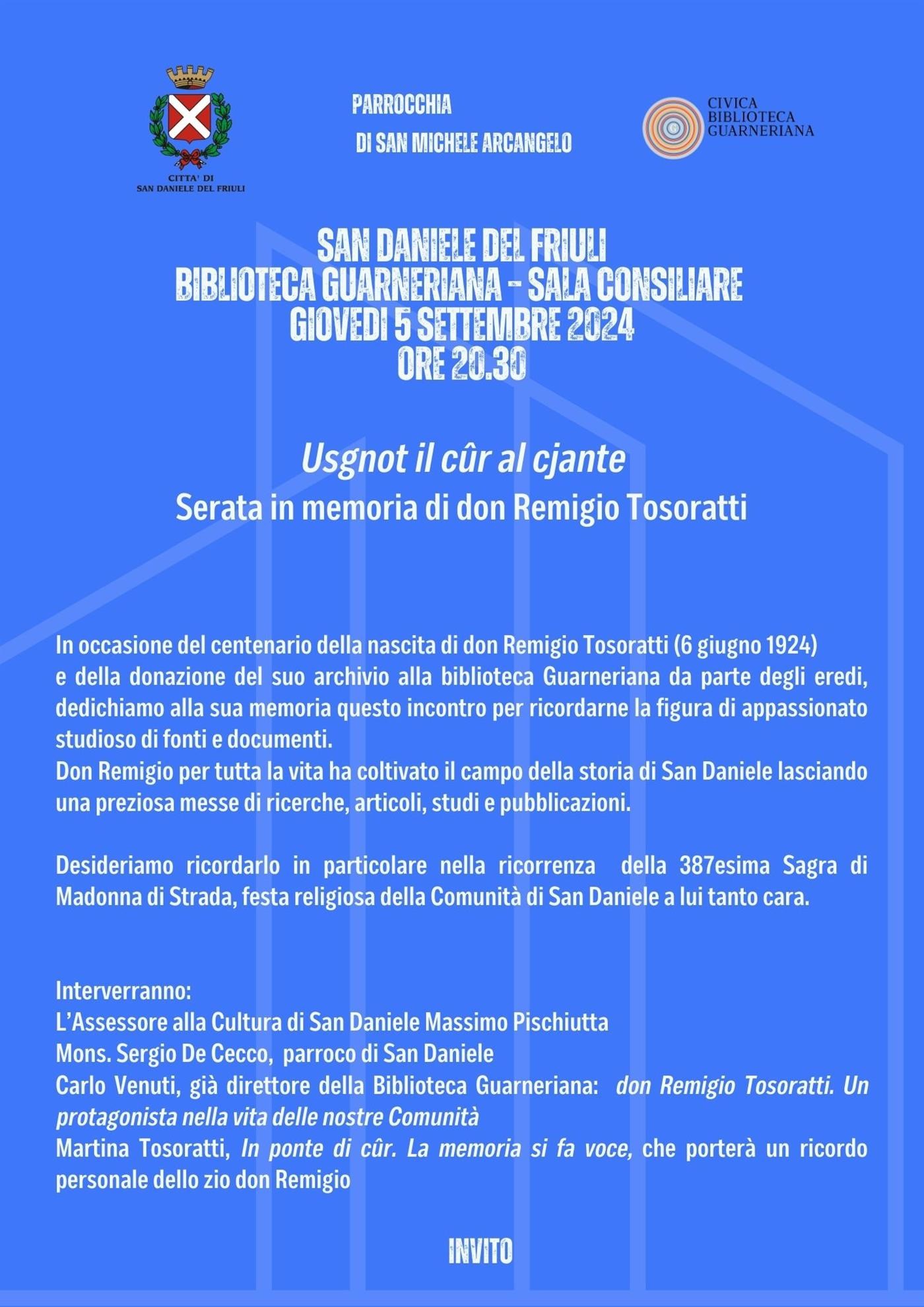 In occasione del centenario della nascita di don Remigio Tosoratti (6 giugno 1924) e della donazione del suo archivio alla biblioteca Guarneriana da parte degli eredi, dedichiamo alla sua memoria questo incontro per ricordarne la figura di appassionato studioso di fonti e documenti. Don Remigio per tutta la vita ha coltivato il campo della storia di San Daniele lasciando una preziosa messe di ricerche, articoli, studi e pubblicazioni.