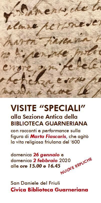 La visita prevede una breve narrazione della storia della biblioteca e del suo patrimonio, con un focus sui documenti archivistici conservati in Guarneriana, con particolare attenzione per quelli riguardanti la figura di Marta Fiascaris, che nel 1600 agitò la vita religiosa di San Daniele e non solo. Un personaggio di grande fascino e mistero, strega, santa, ribelle, proto femminista, che fu al centro di uno dei più controversi e lunghi processi della Santa Inquisizione del XVII secolo.