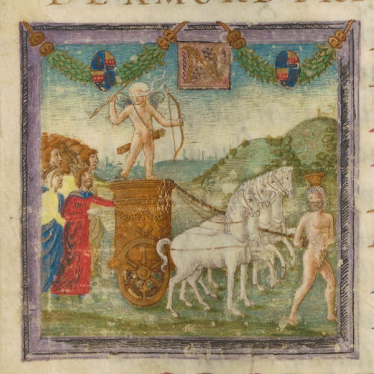 Si tratta di un codice di eleganza sopraffina, in corsiva umanistica e ricco di un ornato splendido con fregi a candelabro, iniziali figurate e istoriate, come quella a carta 9 recto che raffigura il poeta laureato con un libro aperto tra le mani, o come quella a carta 150 recto che mostra Cupido bendato con l'arco in mano, ritto su un cocchio.